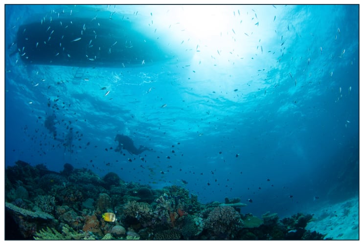 その境界の下を、小さな魚たちとダイバーの影が行き交います。